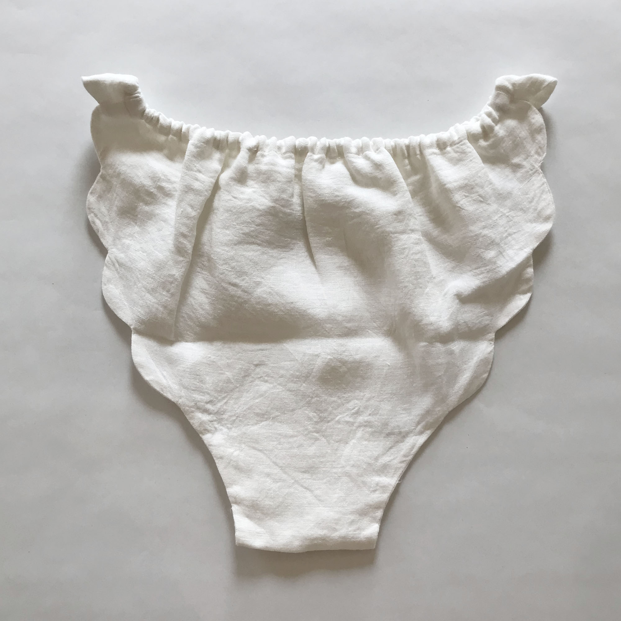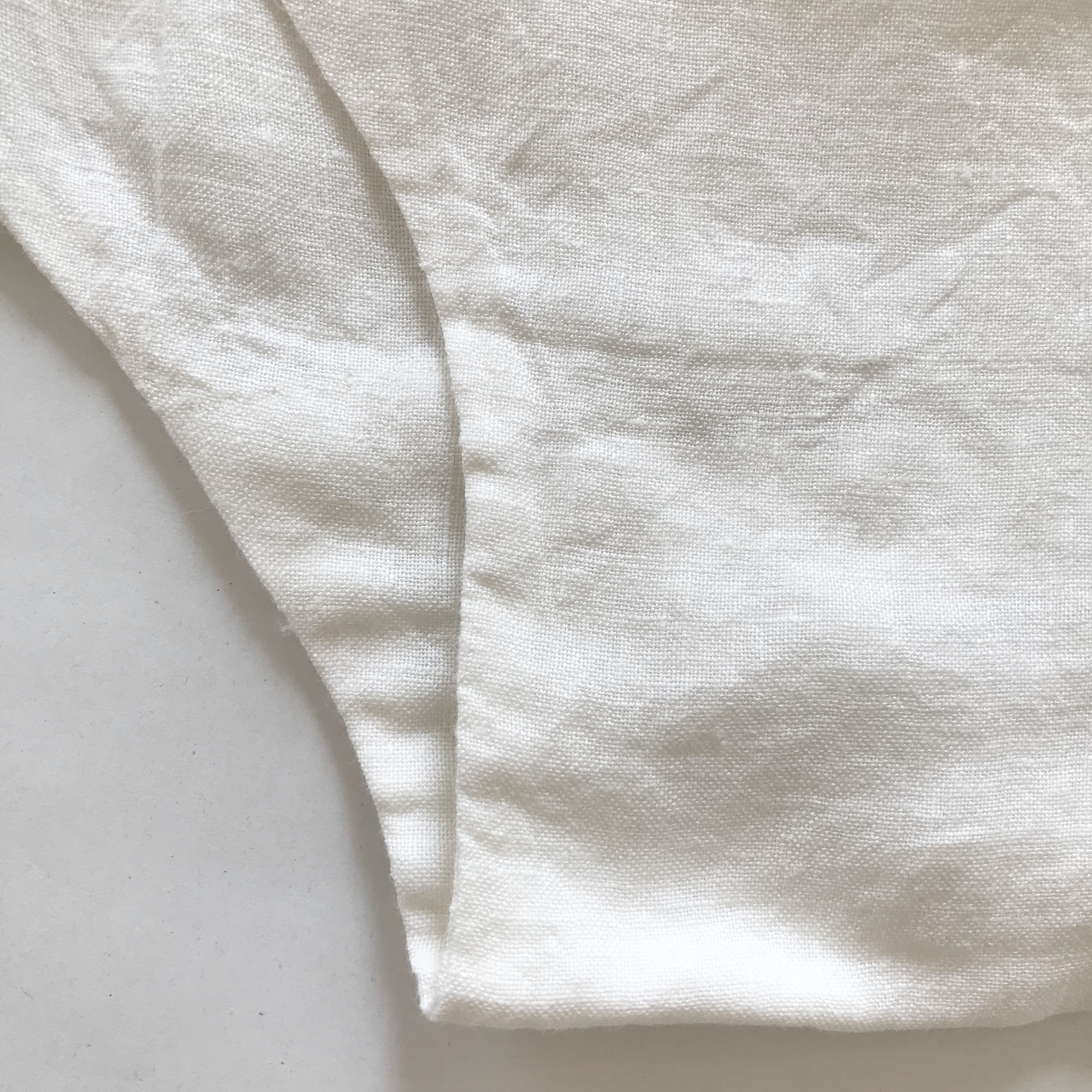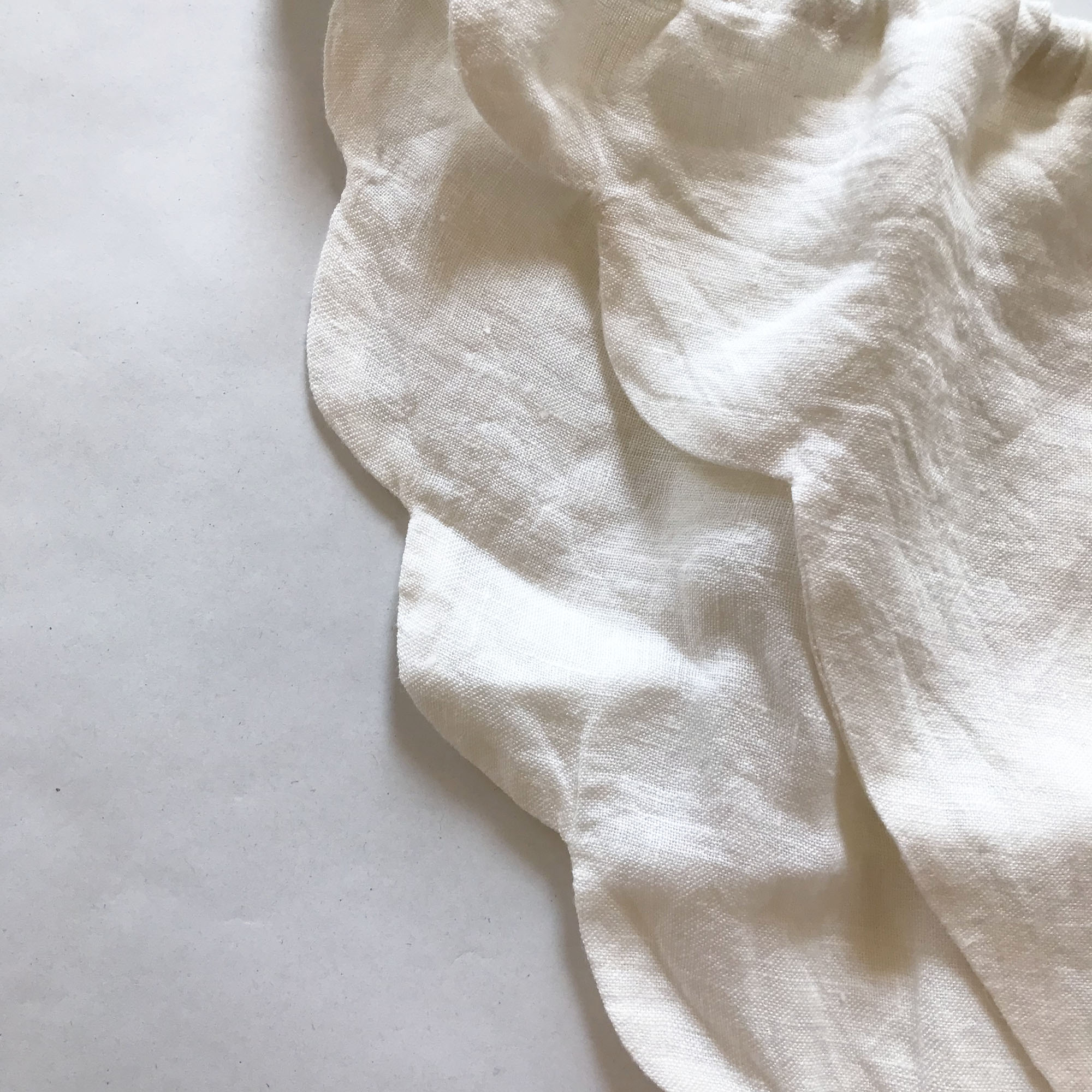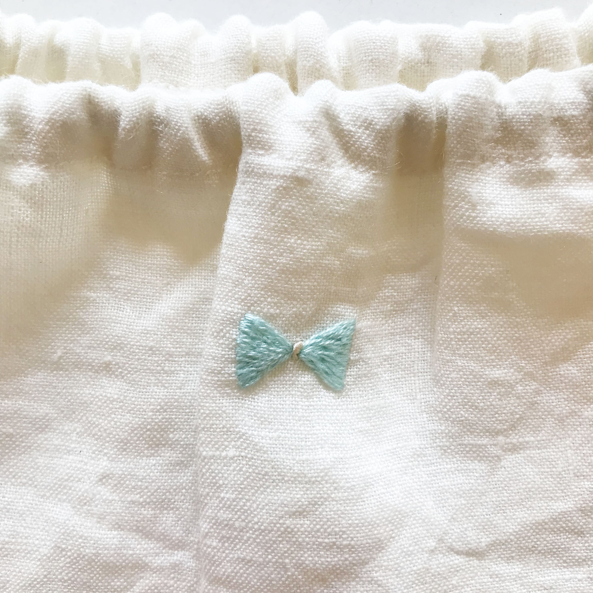 オフホワイトのリネンに、フロントのリボン刺繍やサイドのスカラップなど、さりげない可愛らしさにキュンとします。