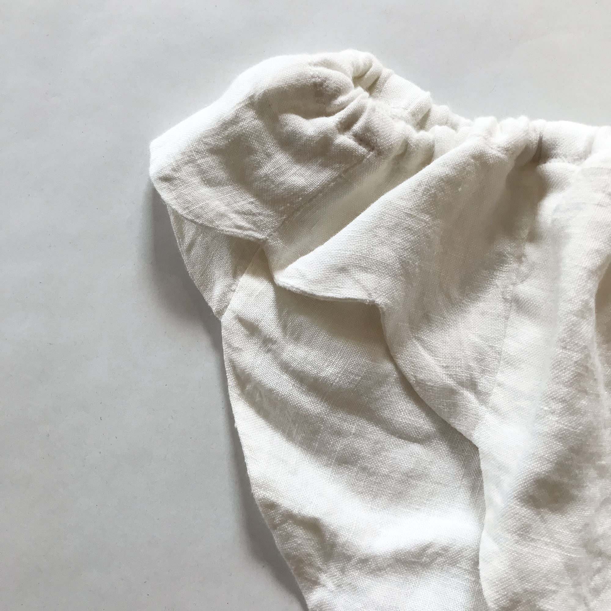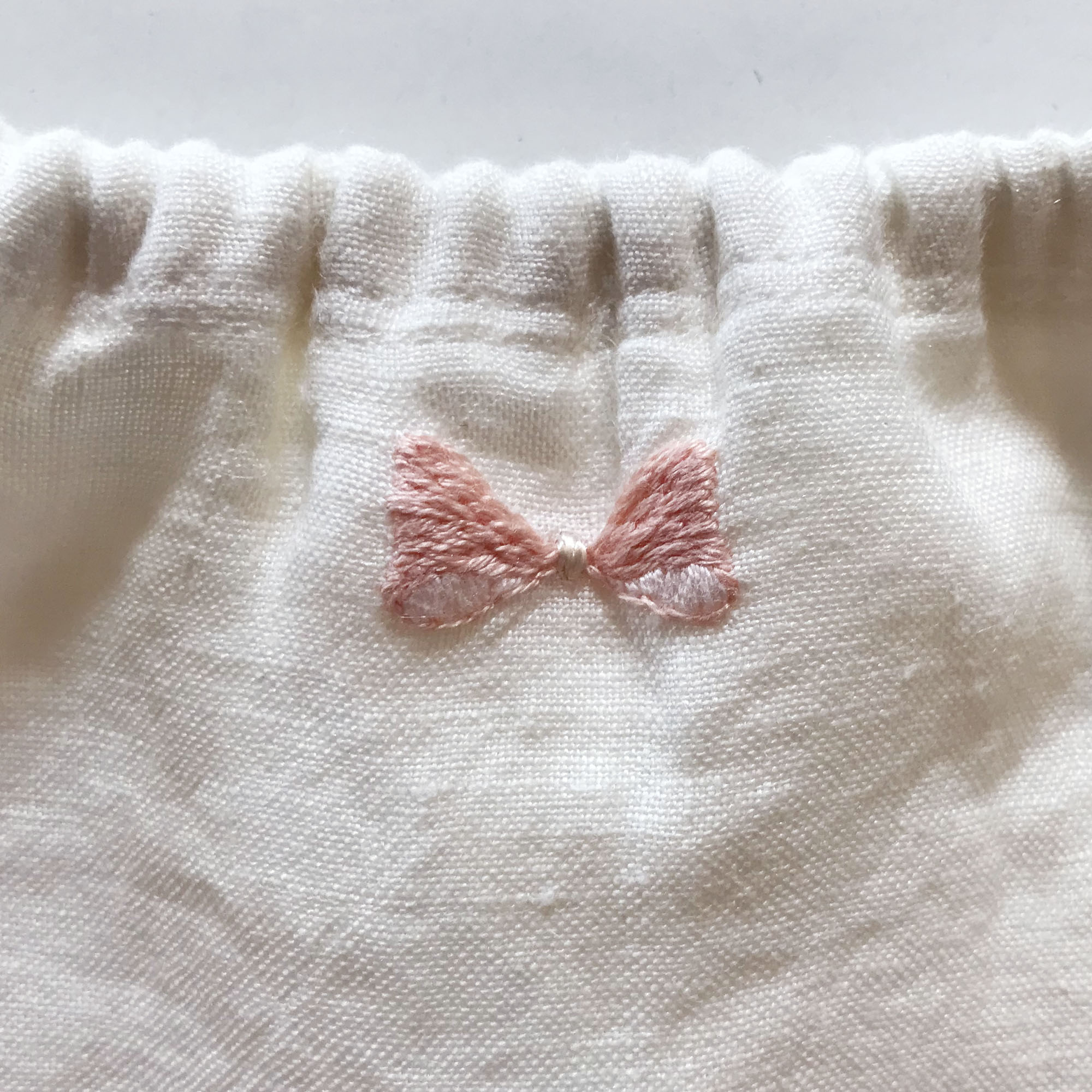 オフホワイトのリネンに、フロントのリボン刺繍やサイドのスカラップなど、さりげない可愛らしさにキュンとします。