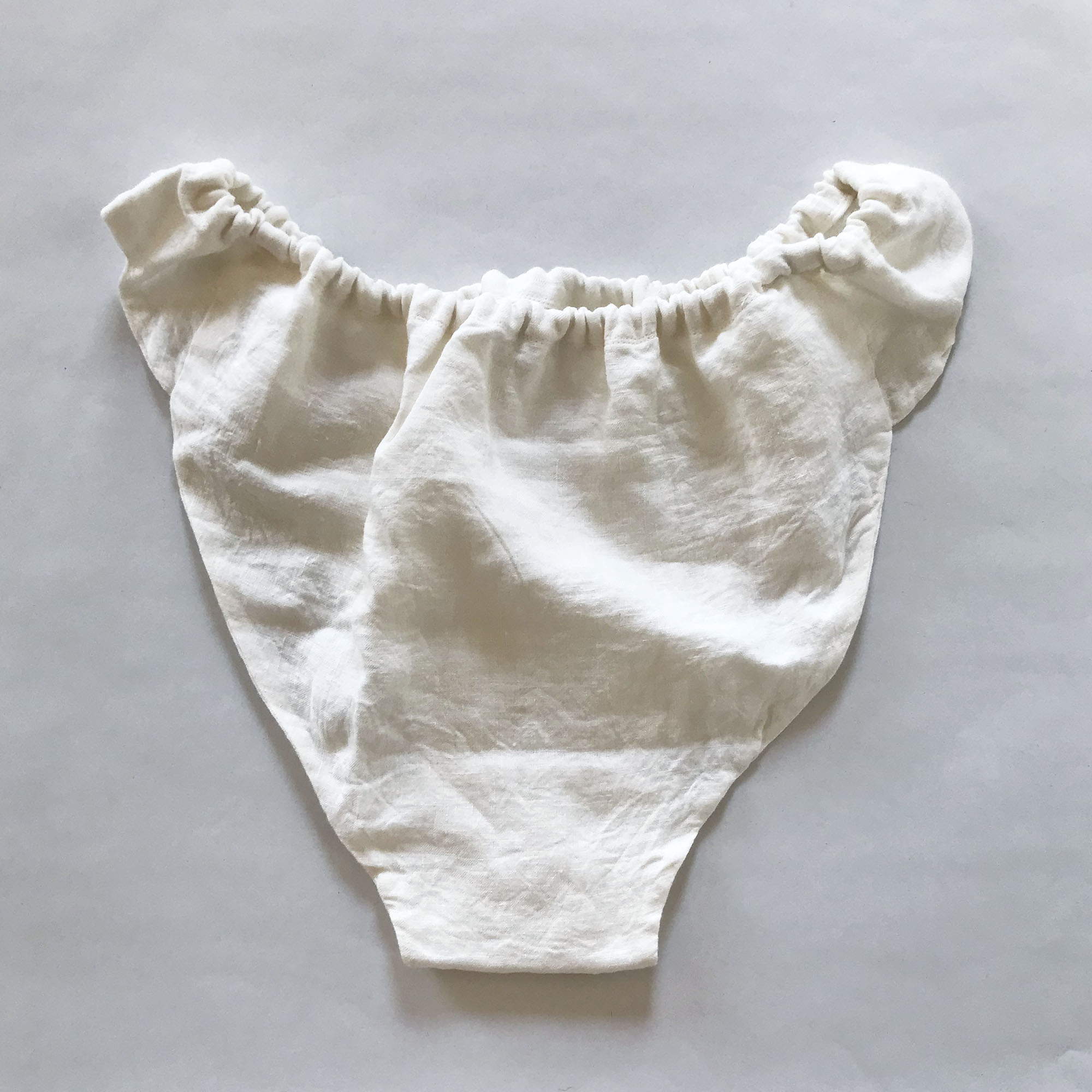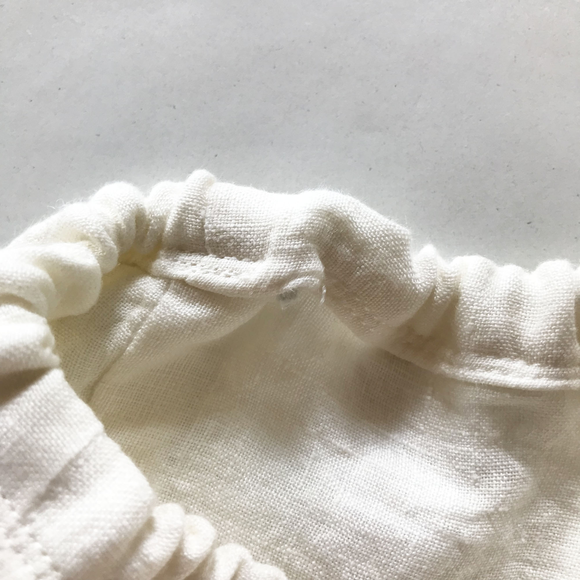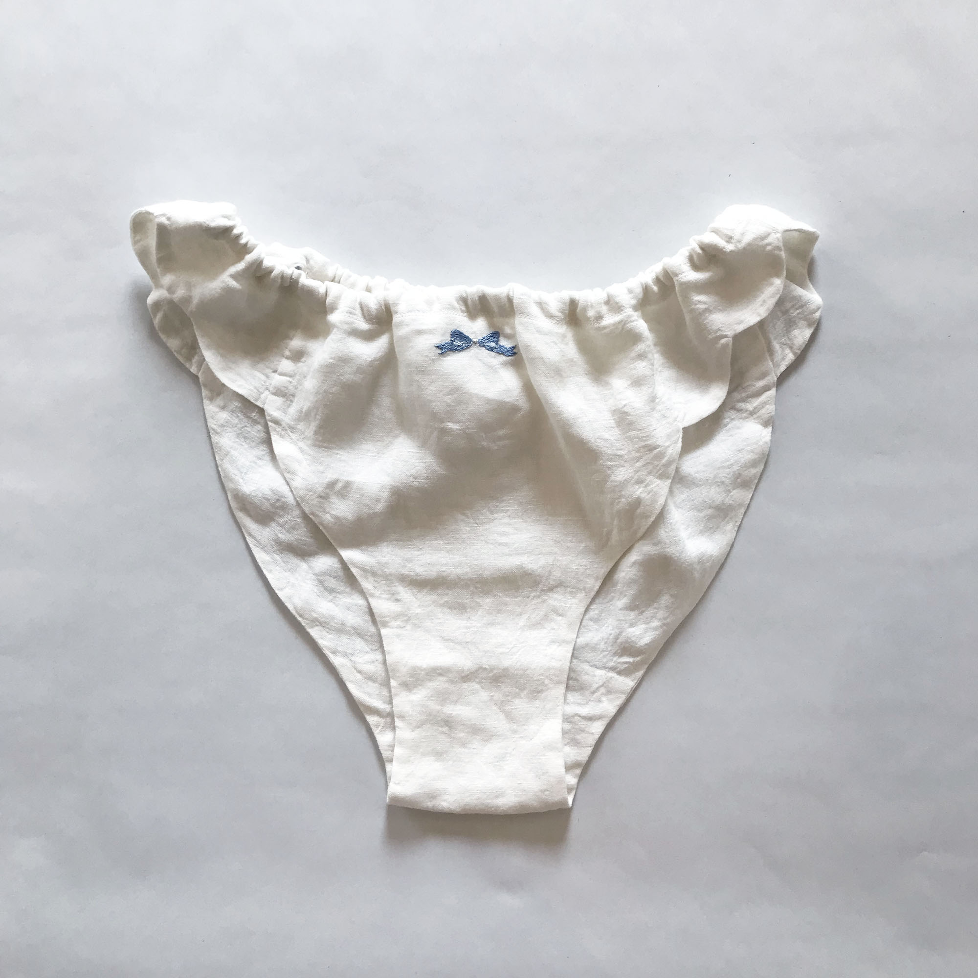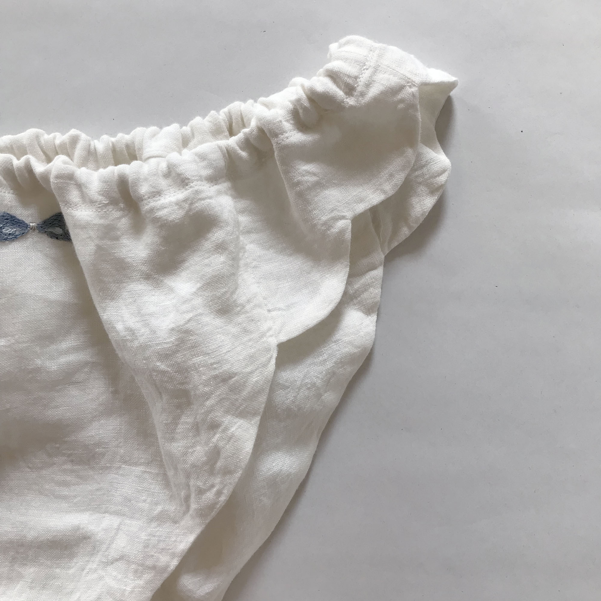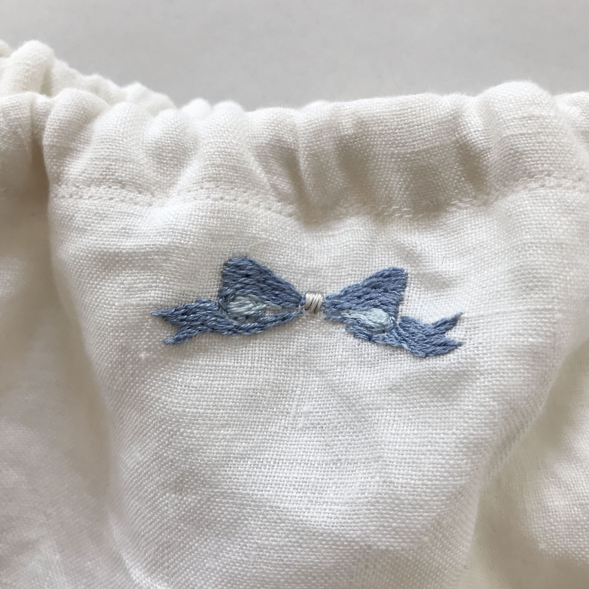 オフホワイトのリネンに、フロントのリボン刺繍やサイドのスカラップなど、さりげない可愛らしさにキュンとします。