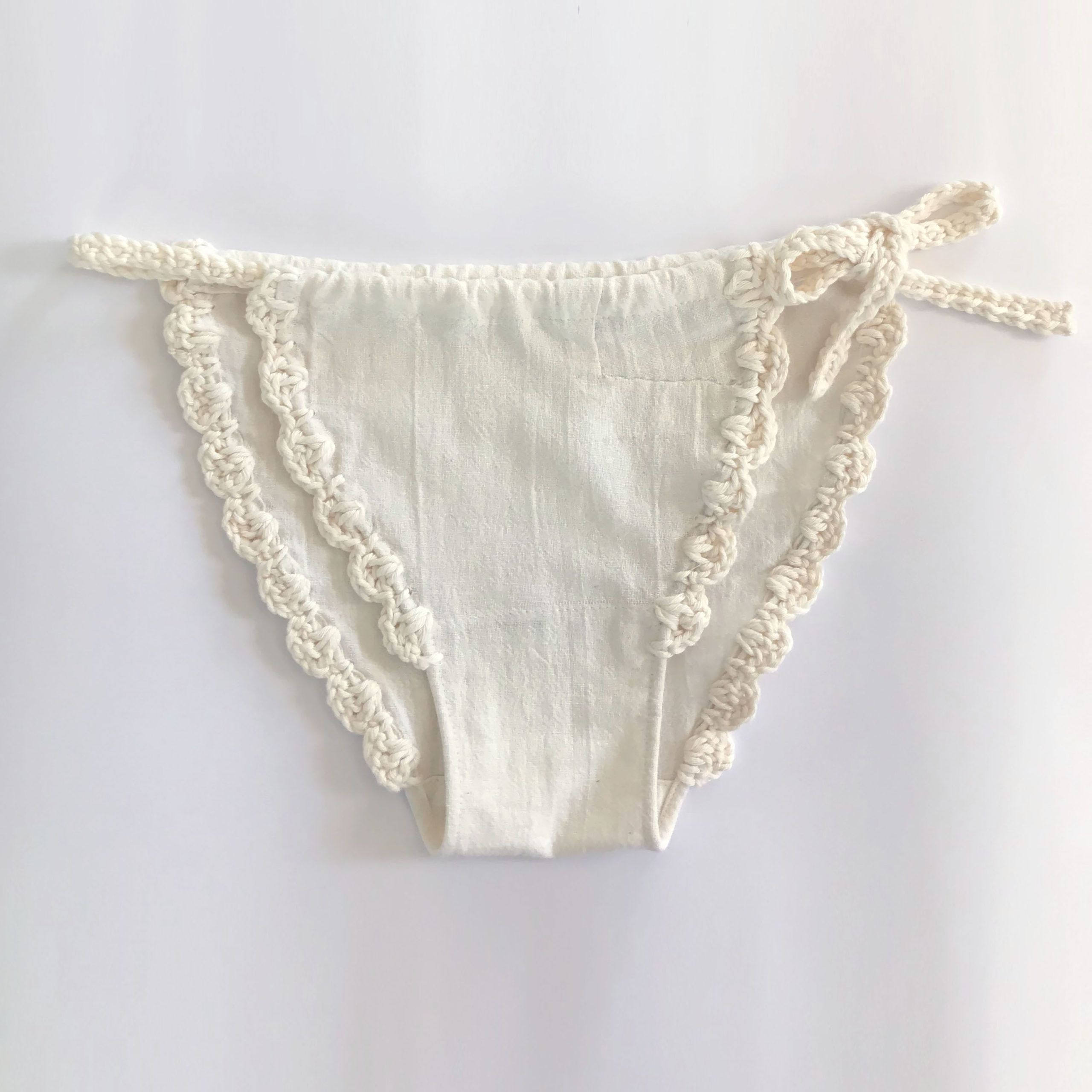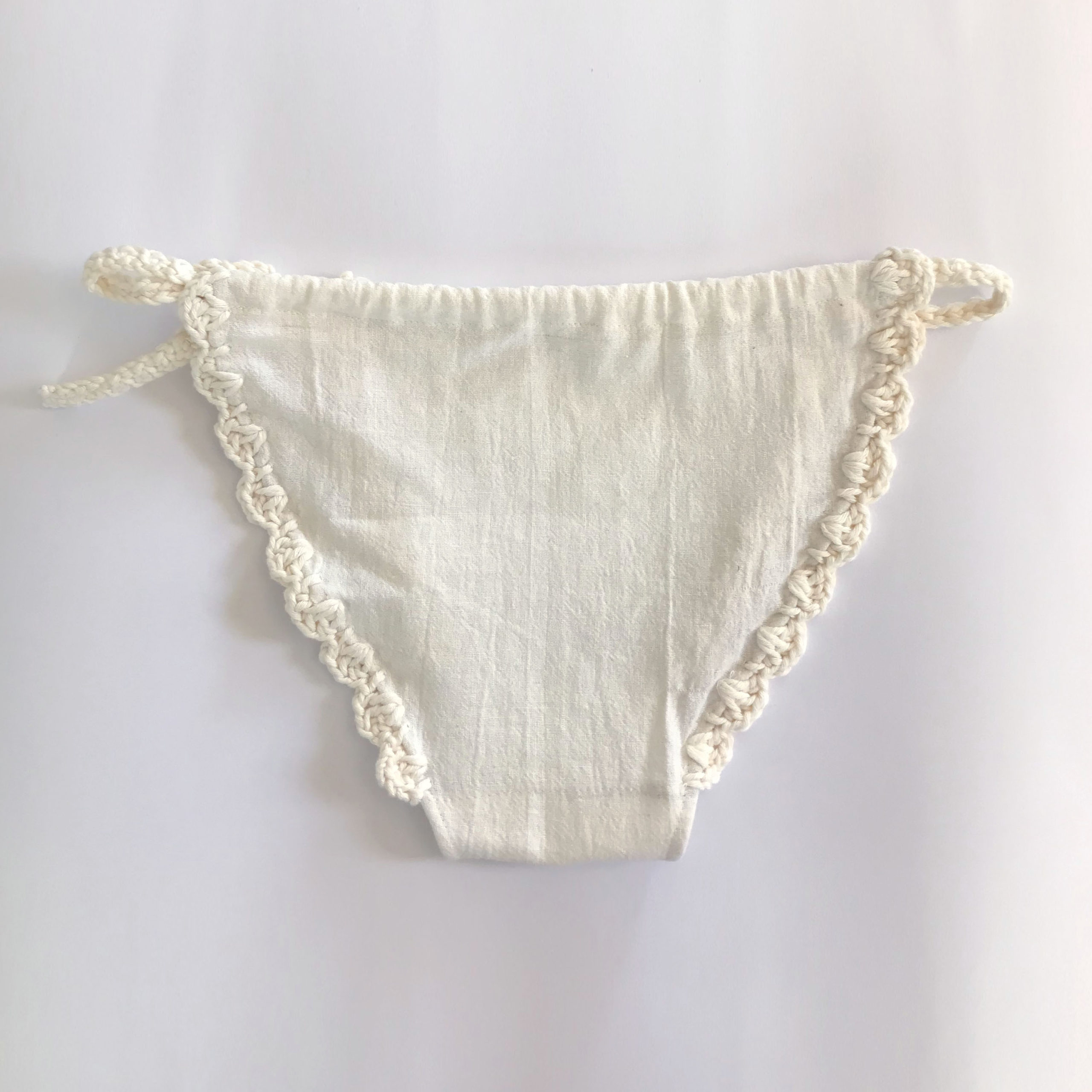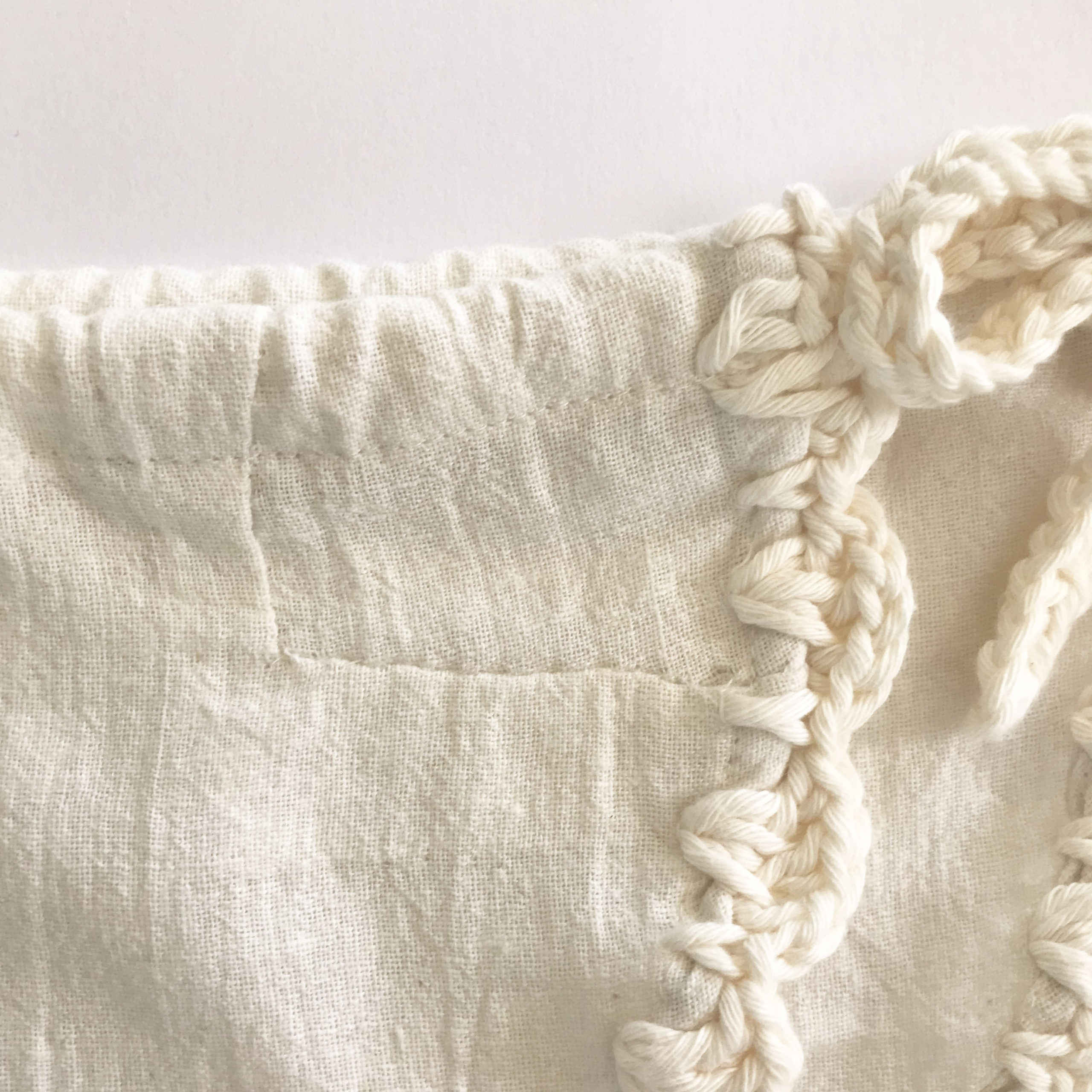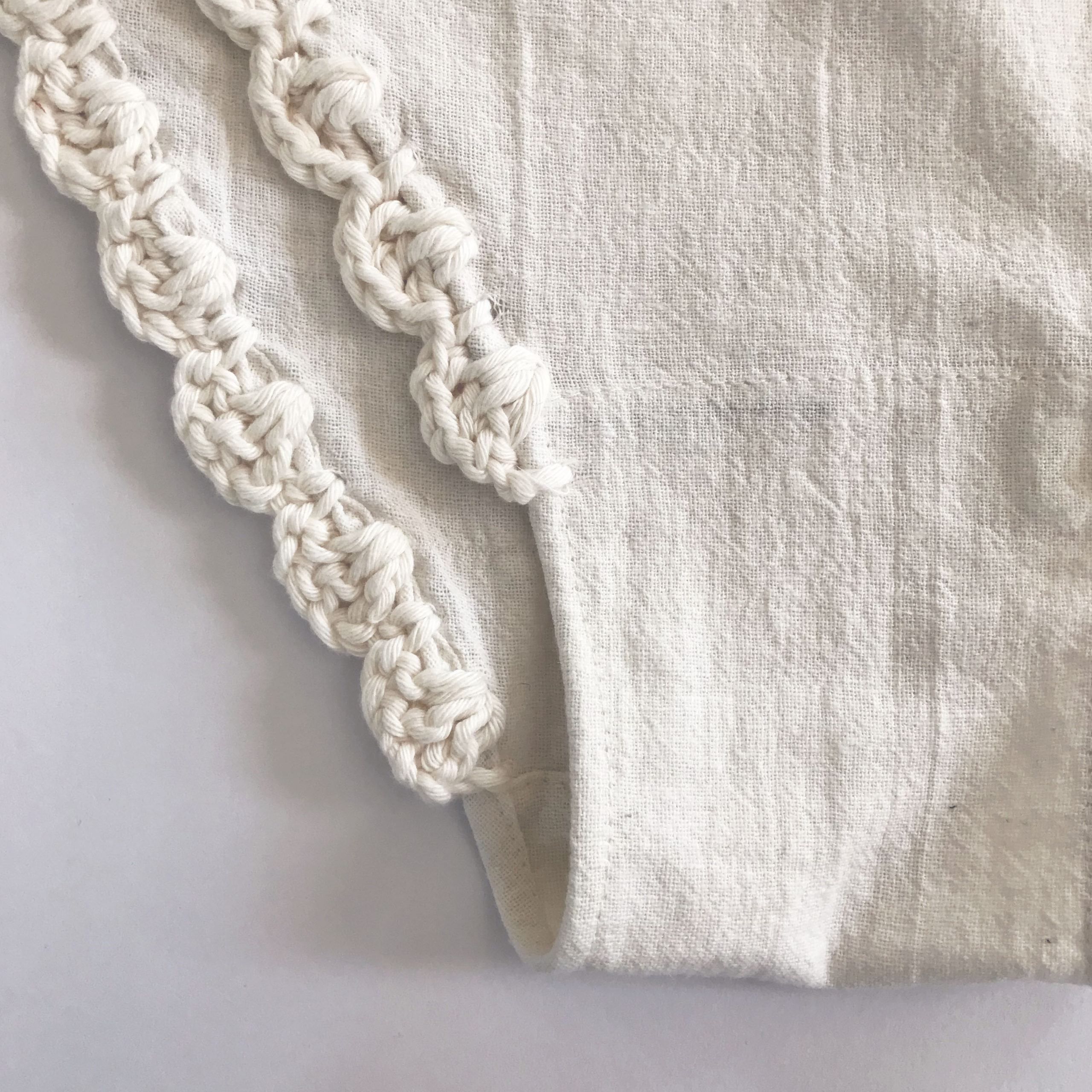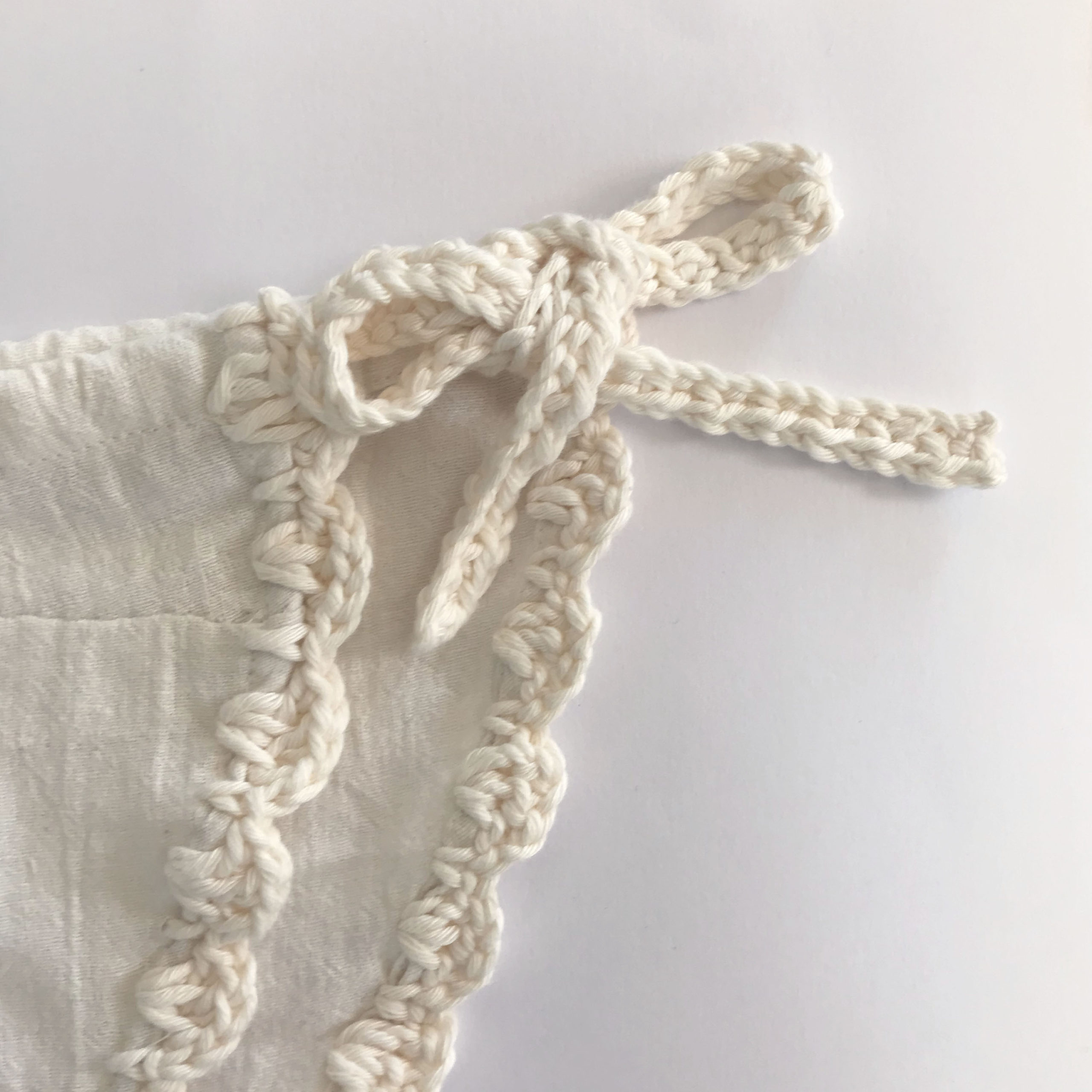生成りのコットン素材に、クロシェのレースをあしらいました。